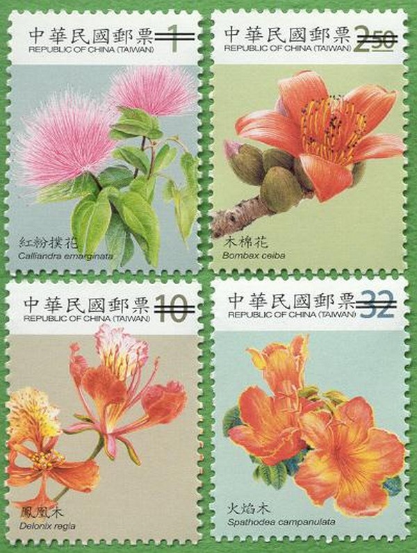 花卉郵票(第2輯) 發行日期:民國98年10月14日 繼98年3月12日發行「花卉郵票」系列常用郵票第1輯,本公司續以紅粉撲花、木棉花、鳳凰木及火焰木為題材,發行「花卉郵票(第2輯)」1組4枚,本組郵票規劃者為行政院農業委員會林業試驗所前所長金恆鑣博士與行政院農業委員會農業試驗所花卉研究中心主任謝廷芳博士,郵票圖案係委請柯鴻圖先生精心繪製,由中央印製廠以彩色平凹版印製,預定於98年10月14日發行。茲將本組郵票圖案簡介如下: (一)紅粉撲花(面值1元):豆科,半落葉灌木,別稱凹葉紅合歡、粉紅合歡。葉片為二回羽狀複葉,長橢圓狀披針形,夜間會閉合,白天再展開;開花型態呈頭狀花序,腋生,花冠呈半圓形,花絲細長,密集,狀似粉撲,適合庭園景觀美化。 (二)木棉花(面值2.5元):木棉科,落葉喬木,又稱攀枝花、英雄樹。葉為掌狀複葉;花冠5瓣,萼杯形,有橙紅與紅兩色;果為蒴果,成熟後會自動裂開,散發出密披棉毛之種子。樹形具陽剛之美,四季各有不同的觀賞型貌,最大特色是先開花,後展葉。 (三)鳳凰木(面值10元):豆科,落葉喬木,幹基多有板根,樹冠呈傘狀,別名金鳳樹、紅花楹樹、火樹、九腳蹄。葉對生,二回羽狀複葉;花為頂生總狀花序,花瓣5枚,鮮紅色帶黃暈,花絲細長紅色,盛開於六月,常為畢業的象徵。鳳凰木植株高大,主供薪炭材、觀賞、行道樹之用。 (四)火焰木(面值32元):紫葳科,落葉喬木,別稱泉樹。葉對生,一回單數羽狀複葉,小葉卵狀長橢圓形;花為頂生圓錐花序,自圓形花苞外圍依序綻放,花色橙紅到豔紅,頂生於樹梢,宛如火焰。生長環境喜高溫及日照充足,普遍用為行道樹、庭園植物。